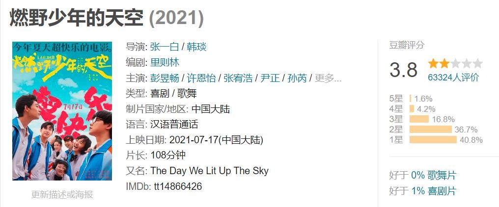 影版《燃野少年的天空》已上映,在原基础上加入歌舞元素,反响平平,豆瓣3.8分。