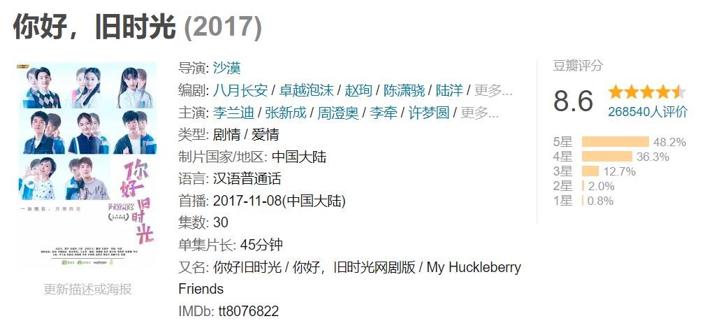30集青春校园剧,2017年11月8日在爱奇艺首播,豆瓣8.6分,打分人数26万+。