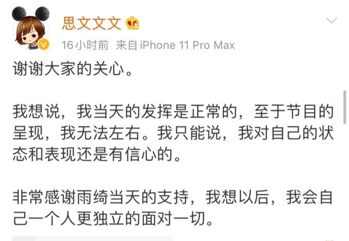 思文曾在23日凌晨回应在《脱口秀大会》中被淘汰时写道:我想以后,我会自己一个人更独立的面对一切。”