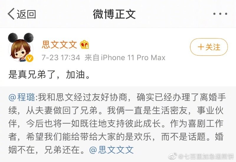 23日下午,脱口秀演员程璐发文宣布与思文离婚:“我和思文经过友好协商,确实已经办理了离婚手续,从夫妻做回了兄弟。”并表示二人将继续支持彼此,希望能给大家带来的是欢乐而不是话题。此前,有网友称在民政局门口看到了办理离婚的思文和程璐,引发热议。