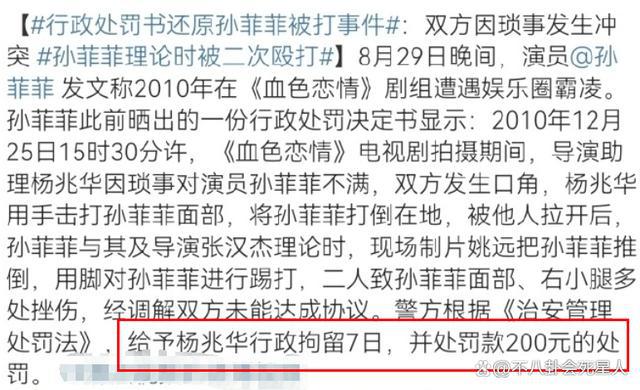 所以这件事一开始并没有被立案,因为整个剧组都在否认打人事件,直到最后被曝光了才立案,最后的处理结果是,霸凌者之一的杨兆华被拘留 7 天,罚款 200 元。