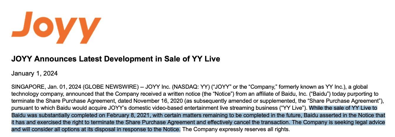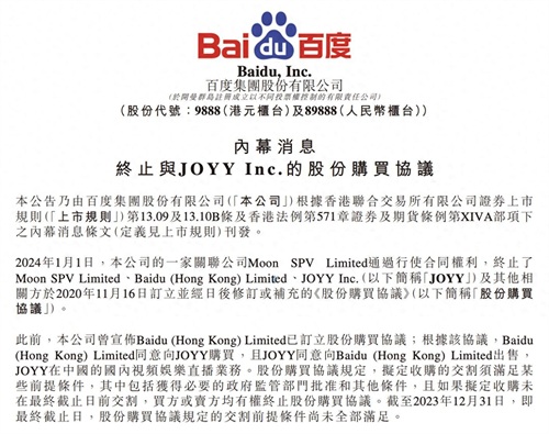 2024年1月1日,百度(09888.HK)在港交所发布公告称,终止与JOYY,即欢聚集团(NASDAQ:YY)的股份购买协议,持续三年之久的YY直播收购项目告吹。