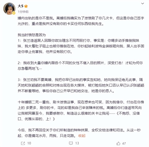 大S在文章中表达了她的决心与坚定,她将不再容忍汪小菲和他背后的势力的诽谤和谎言。她决心将一切问题交给法律和司法,坚定维护自己的权益。最后,她以坚定的语气宣告,要重新踏上自己的花路,这无疑是她对未来的信心和期许。