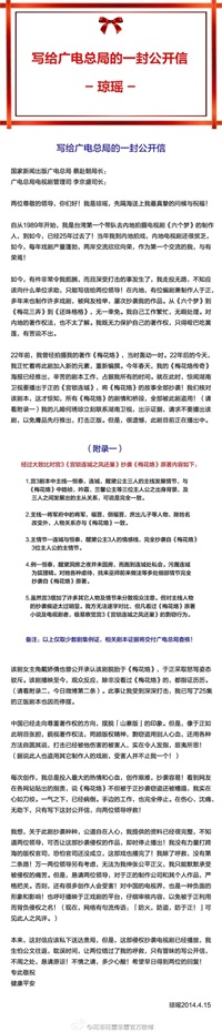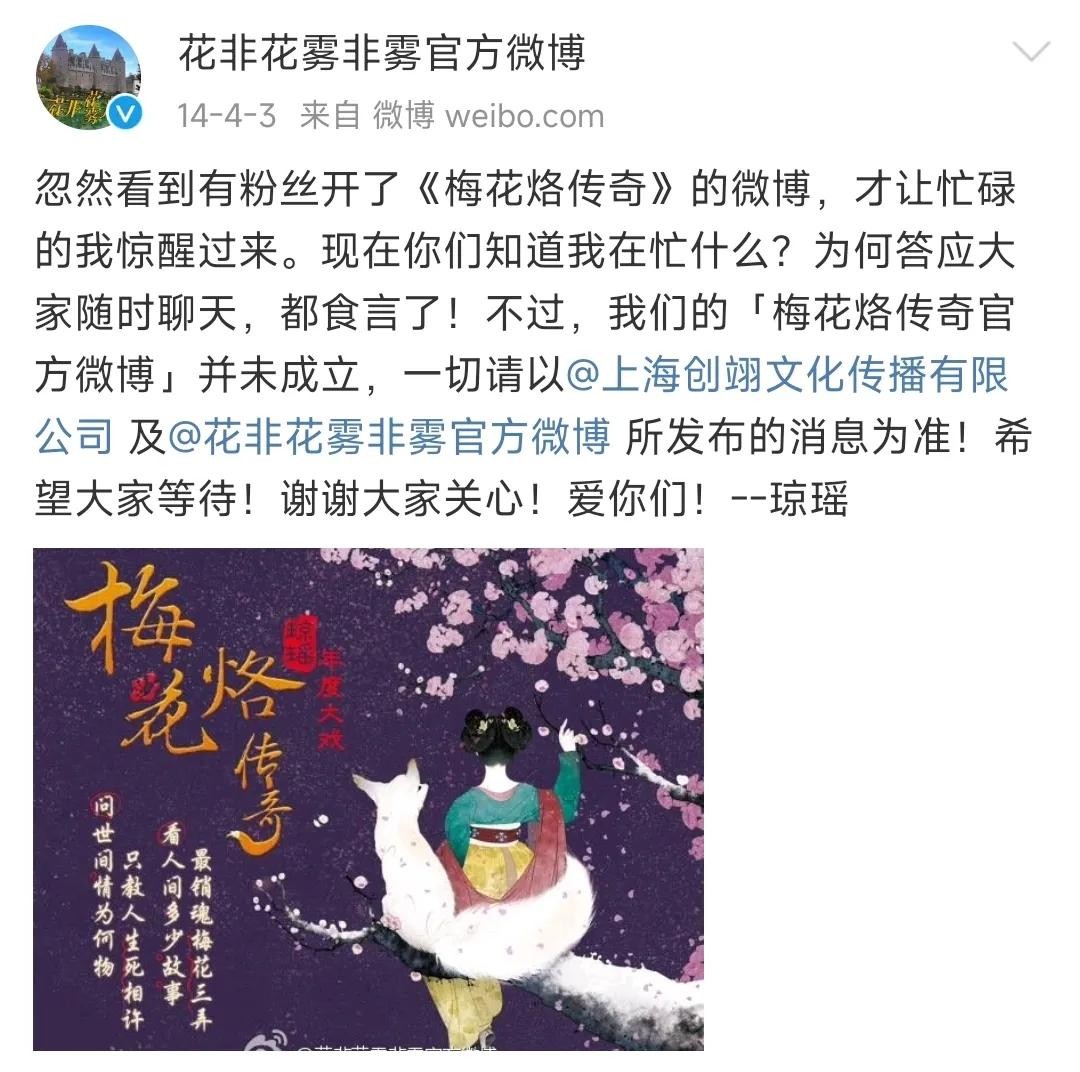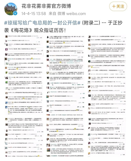 于是2014年4月15日,琼瑶用当时《花非花雾非雾》的官方某博发声,直接写给审核电视剧的监察机构广电总局,希望叫停,