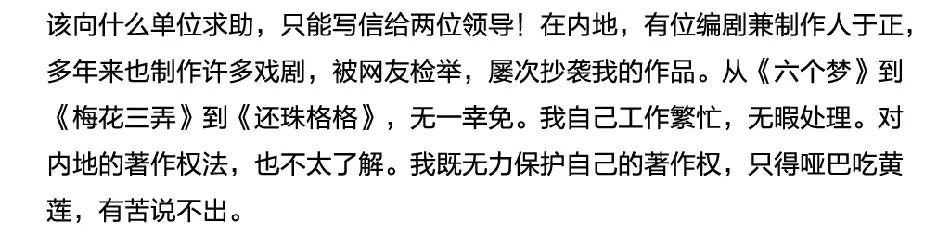 琼瑶在信中写道:辛辛苦苦写的作品,不光被抄袭,还被糟蹋,
