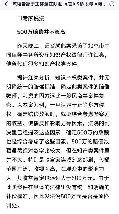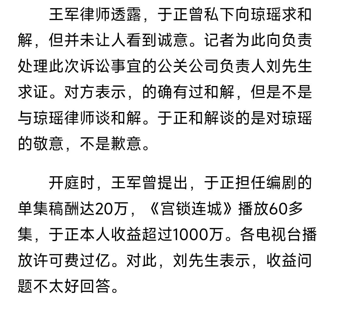 琼瑶的诉讼律师王军透露,于正曾经私下希望和琼瑶和解,琼瑶方拒绝,《宫锁连城》一共60集,单集于正的稿费就在20万,也就是1200万,