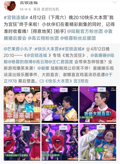 剧中的主演袁姗姗、陆毅,还于2024年4月12日剧刚开播不久,就上了《快乐大本营》