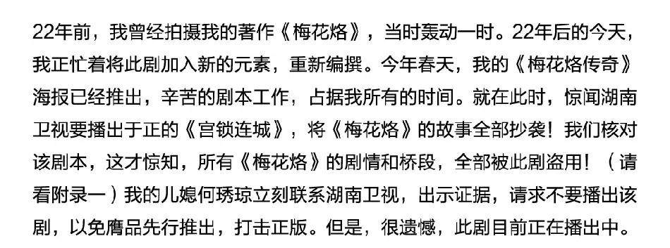 根据琼瑶的控诉,这已经不是于正第一次抄袭她的作品了,根据她写给广电总局的信中描述,她的著作《六个梦》、《梅花三弄》、《还珠格格》都被抄袭过
