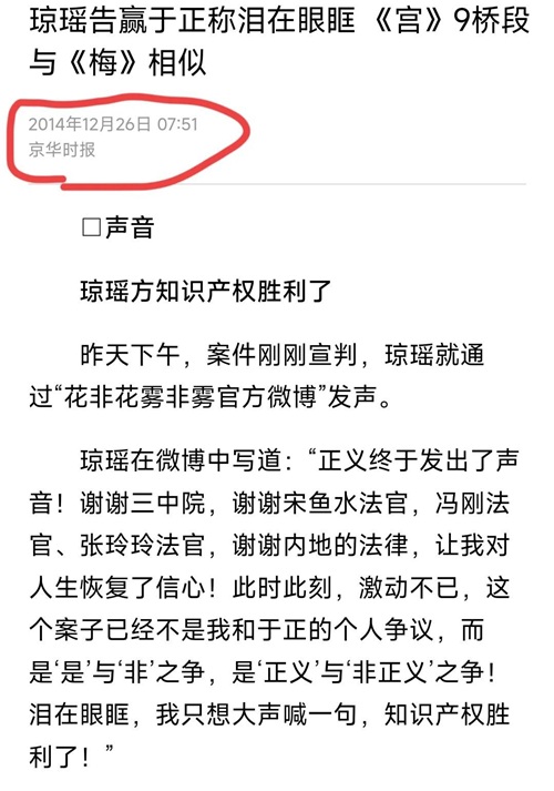 2014年12月6日,根据《新京报》的报道,琼瑶打赢了官司,