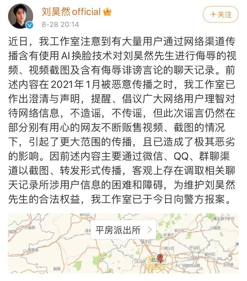 别说是公众人物,就算是普通人,受此诬陷羞辱,也是忿不可遏,更何况刘昊然作为艺人,名声更是大大受损,在事后,刘昊然也在社交平台发声表示已经报警,将用法律手段维护自己的合法权益。