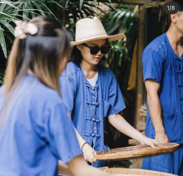 照片中,霍咏盈戴着草帽和墨镜,穿着中式蓝色牛仔服装,脚踩黑色防水鞋,朴素的打扮与平日的高贵形象形成鲜明对比。