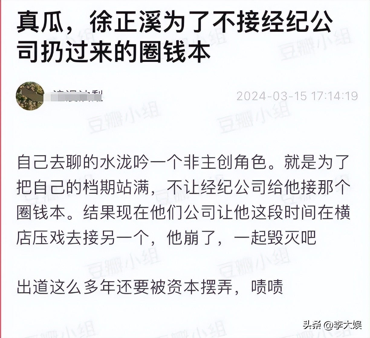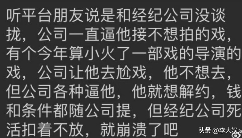 第二个爆料则称徐正溪合约快到期了,但是经纪公司不放人,继续逼他演不想演的剧,所以徐正溪没有办法,最终选择退圈。事后也有网友补充说其实早在半年前就有听说过这个消息了,起因就是公司一直在主导他接什么戏,最近逼他轧戏不放人,导致他自己想演的戏没了,所以他崩溃就官宣退圈了。