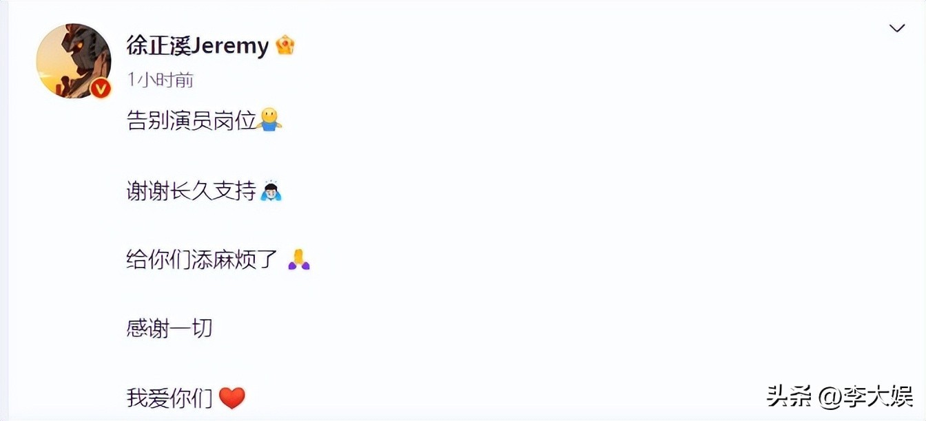 事情的起因得从徐正溪最新一条博文说起,他突然发文“告别演员岗位,谢谢长久支持,给你们添麻烦了,感谢一切,我爱你们 ”,并且配上了一个身穿24号球衣运动员的背影照。文字和图文都指明他是在官宣退出娱乐圈,并且在和粉丝告别以及将其通知给大众。