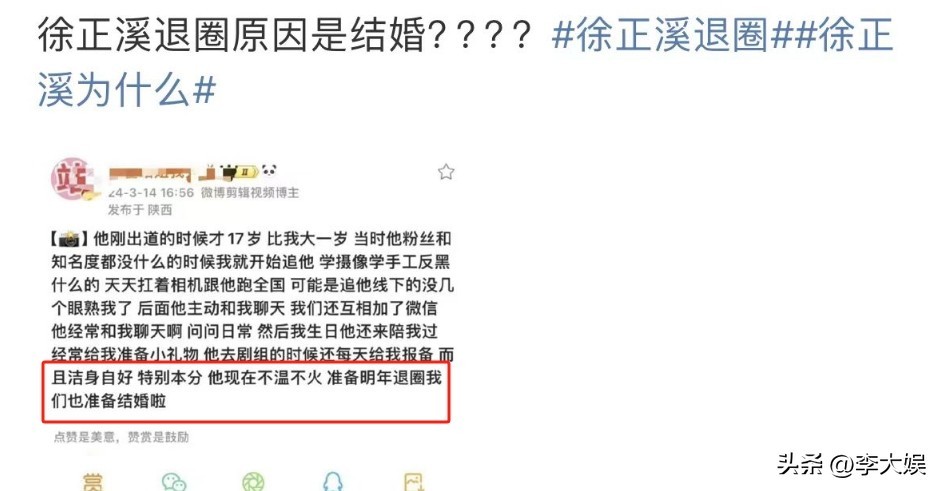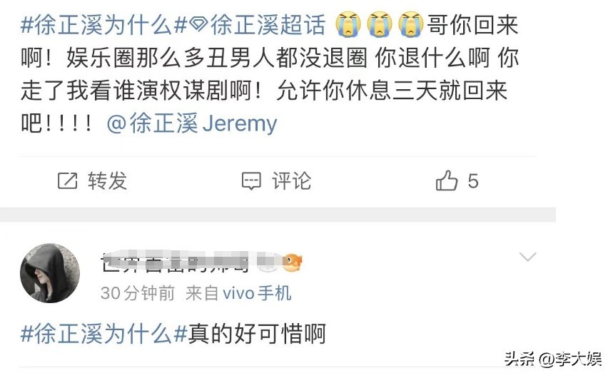 平心而论,相比退圈结婚,因与公司的纠纷不得已退圈,这个原因的可能性更高。但是在本人没有发声之前,徐正溪真正退圈原因还有待考证,可能很复杂,但也有可能只是个人选择,他想尝试下另一种生活呢?你们对此徐正溪突然退圈一事怎么看?
