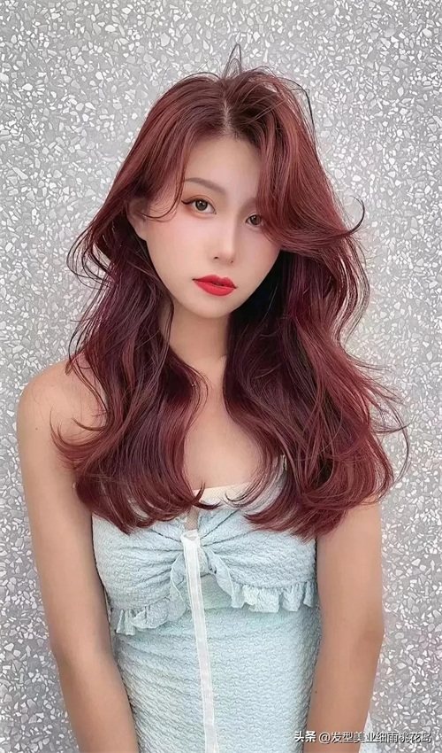 红棕色搭配起来也别有一番风味。微卷造型搭配微卷侧分刘海,是今年特别流行的一款发型,刘海可以将女生的脸型修饰得非常小巧,五官也会得到更大程度的修饰,显得更精致,回头率很高。