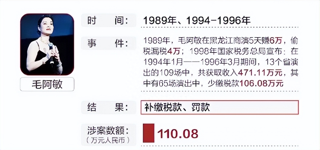 这就是赤裸裸的逃税漏税,于是毛阿敏所在的歌舞团得知了这件事情之后,立即就给了毛阿敏处分,并且罚她禁闭三个月。