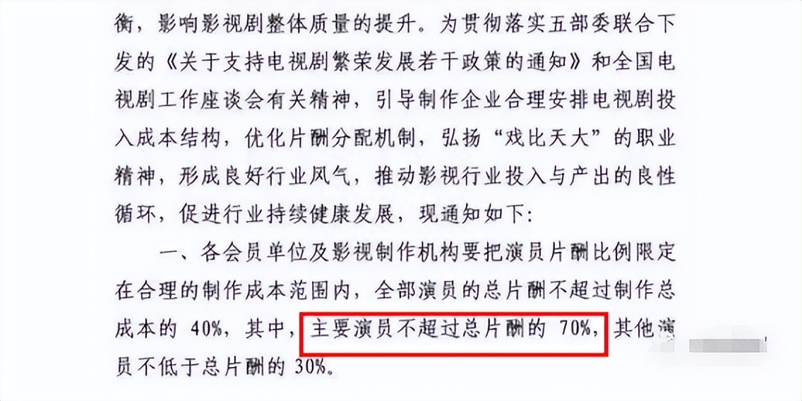 中国广播电影协会就出来整治这种乱象发布了“限薪令”,规定一部剧中全部演员的总片酬不得超过制作总成本的40%。