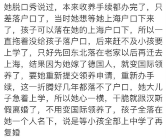 众所周知,金星和汉斯的这种情况没办法要自己的孩子,所以只能通过领养来满足自己对于孩子的喜爱,但是金星老师希望自己的3个孩子都能加入中国国籍,而汉斯是外国人,这也导致一方面国际领养手续很复杂,另一方面夫妻一同领养孩子的户口落在中国的难度也比较大,所以两人最终决定先“离婚”,等孩子的落户手续办完以后再复婚。
