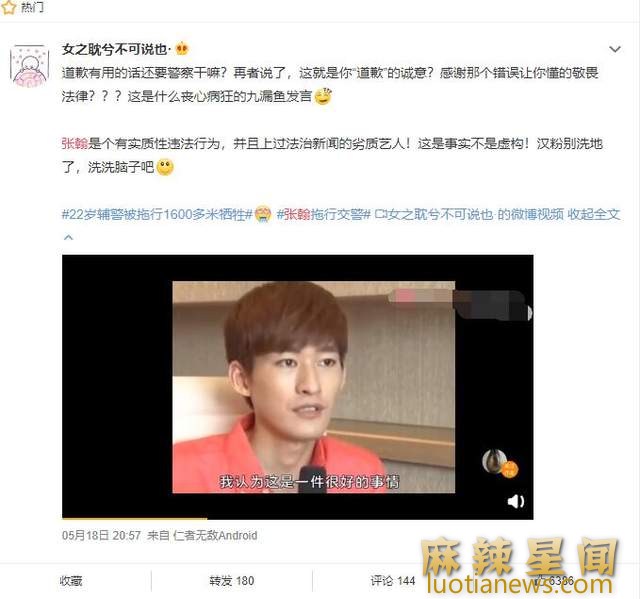 张翰拖行交警事件 张翰回应:年少犯下的错时刻提醒自己