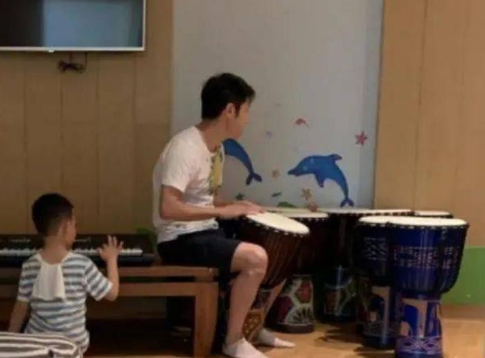 照片中的撒贝宁也相当可爱有趣,光着脚拿着非洲鼓在旁边敲着,看上去就像一个小男孩,完全融入了孩子们的人群中。