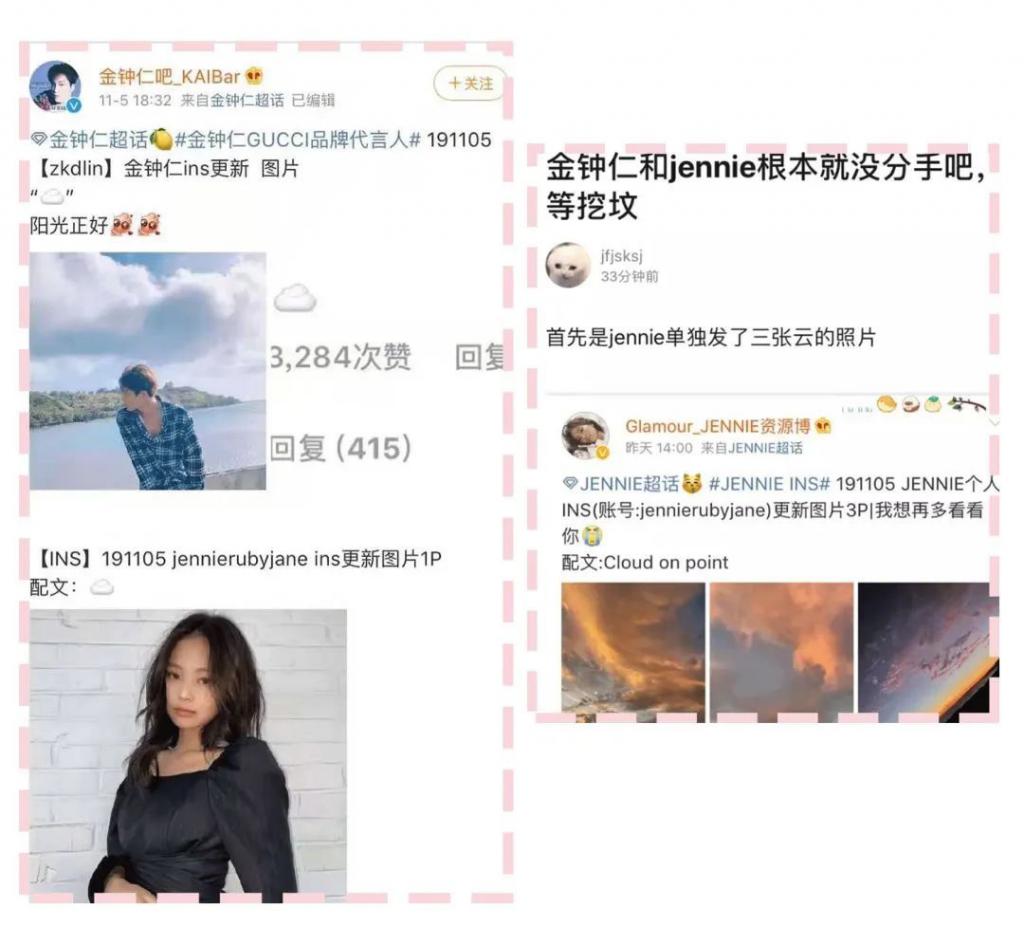 更抓马的是,两人虽然明面上分手分得很干脆利落,但私底下却是小动作不断。Jennie 和金钟仁同时间都分享过三朵云彩的照片,依旧穿同款,Jennie 还对着自家名叫 "KAI" 的狗子说 "MY LOVE"。