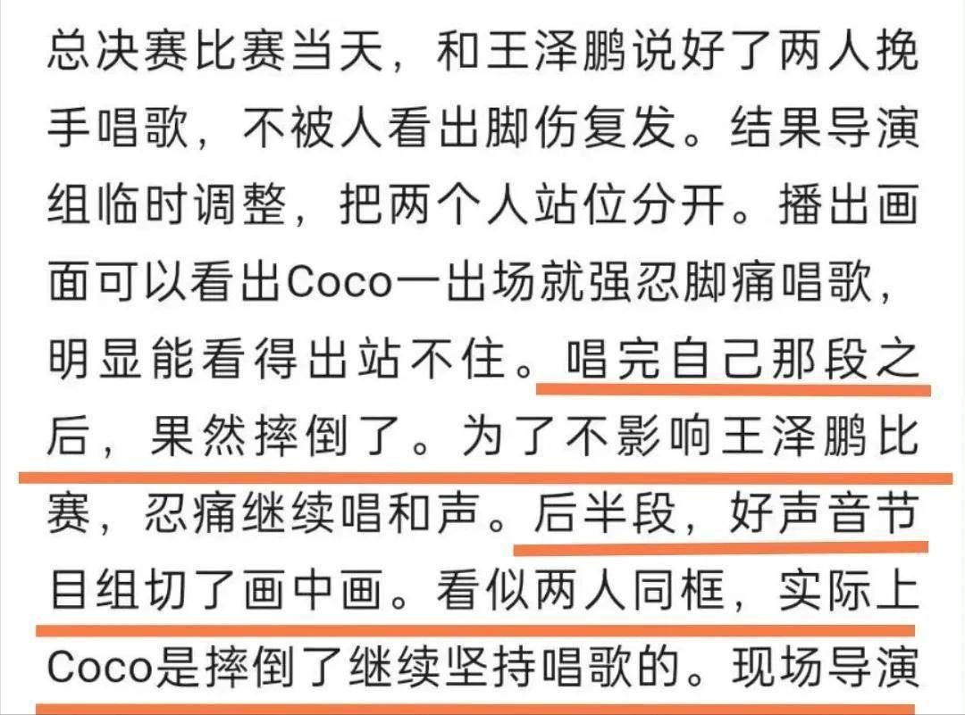 总决赛一般都有这一环节,而李玟录制好声音总决赛时,由于场外原因她的腿受到了严重伤害,连最基本的站立都做不到。