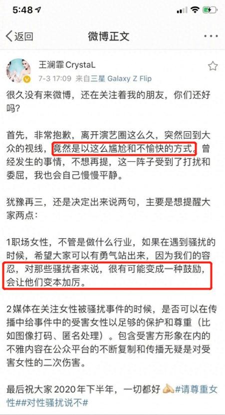 大致意思是表示如果女性在职场中遇到了骚扰,一定要勇敢的站出来。