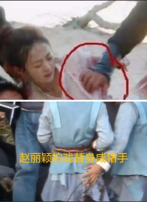 在花絮中,可以很明显地看到一只手放在赵丽颖的胸上。