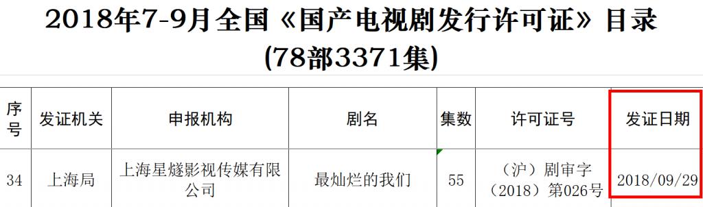 早在 2018 年,《最灿烂的我们》就取得了《电视剧发行许可证》,这个证的有效期是三年,没想到 2021 年许可证过期前都没等到它播出,反而一直压到 2023 年才播。