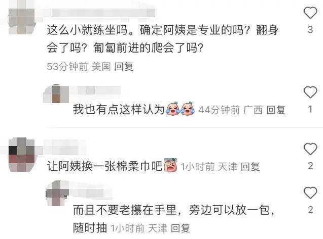 而对于早早就开始训练胖豆坐的阿姨,有宝妈就在程晓玥动态下留言称:" 这么小就练坐吗?确定阿姨是专业的吗?翻身会了吗?匍匐前进的爬会了吗?"
