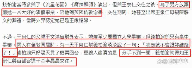 ——钱柏渝为了嫁入豪门,放弃娱乐圈事业陪男方去国外读书,连男方母亲丧礼都去了都得不到承认,她不愿放弃继续选择同居,被当面告知肯定不会娶她,男方和钱柏渝分手不到一周时间,就开始和其他豪门千金交往。