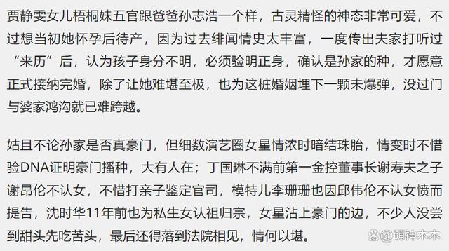 ——贾静雯未婚先孕,被婆家指责情史混乱,进门前还需要做亲子鉴定,这还不是个例。女星丁国琳、沈时华和模特李珊珊都要做亲子鉴定 " 自证清白 ",就看媒体辛辣评价这些女明星:" 沾上豪门的边,不少人没尝上甜头先吃苦头,情何以堪。"