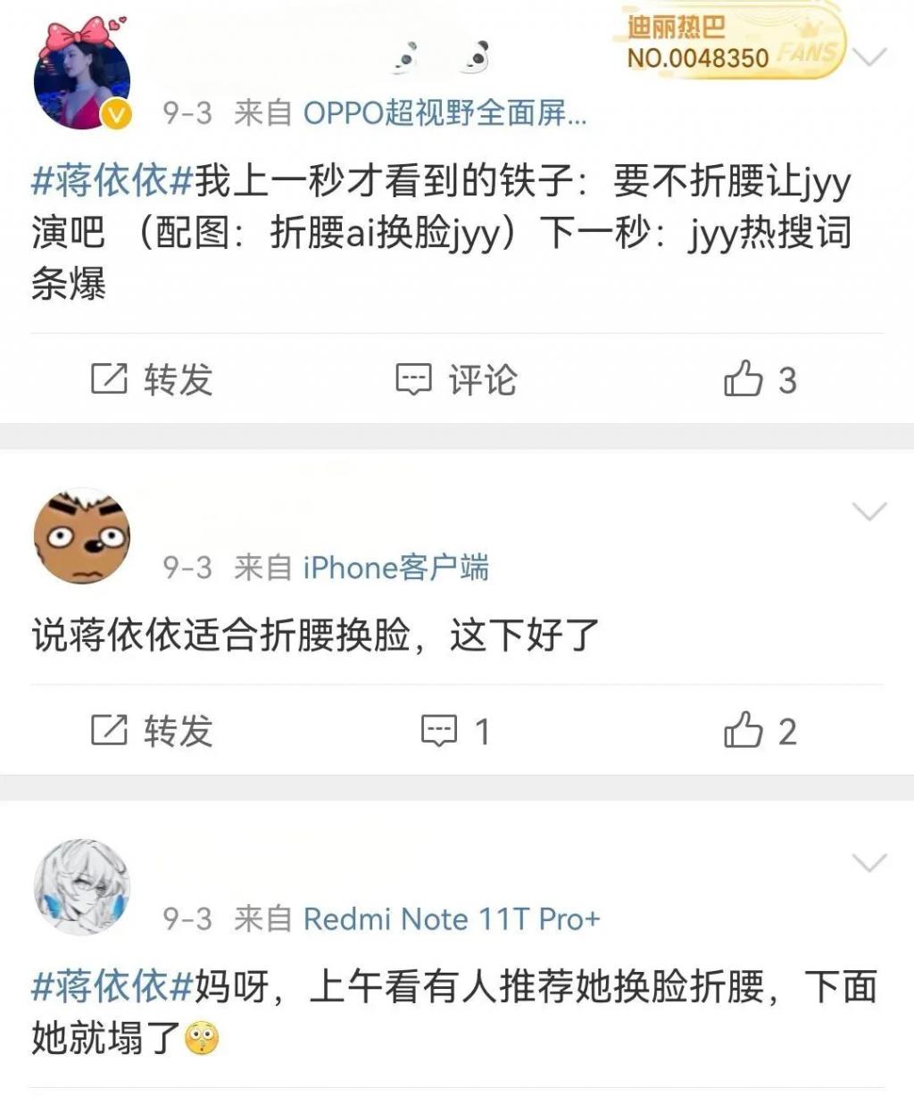 宋祖儿出事的时候,网友们纷纷建议用另一个国民闺女蒋依依 AI 换脸,顶替宋祖儿在折腰里的角色 ~