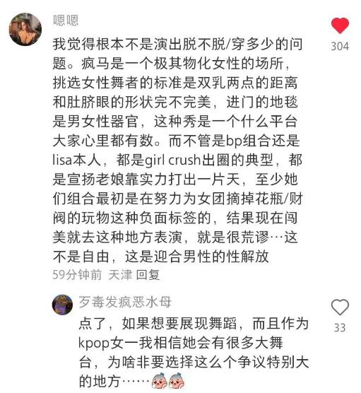 还有路人说,考虑到 BLACKPINK 不少粉丝都是未成年,Lisa 如此 " 成年人 " 的演出,对粉丝来说是不是不太好。