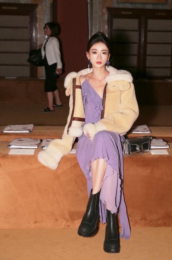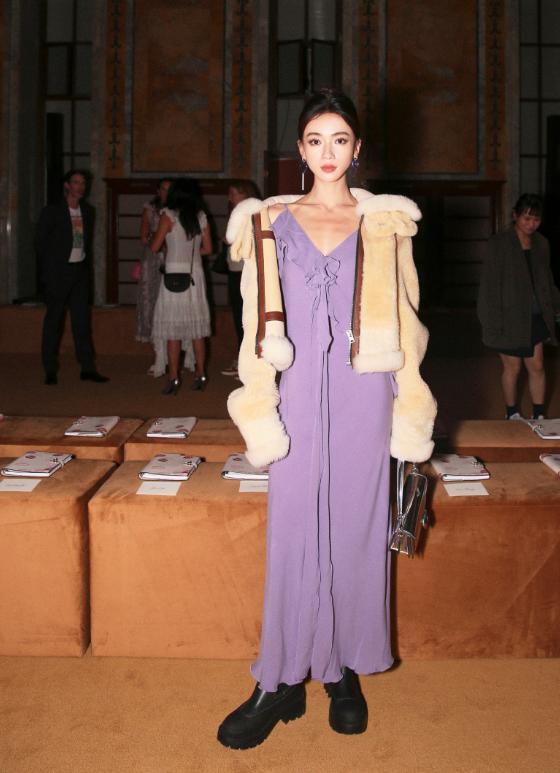 吴谨言身穿紫色长裙来到了秀场,精修图下的她感觉妆好浓,打扮得是挺用心的,就是身高没有托起这套裙子,看起来有一些拖沓感。
