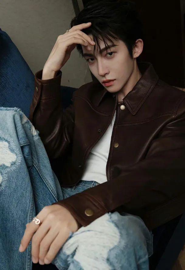 刘宇在时装周上的造型是清新中透着一丝时尚感,咖色皮衣好有范儿,脸部线条也不错。