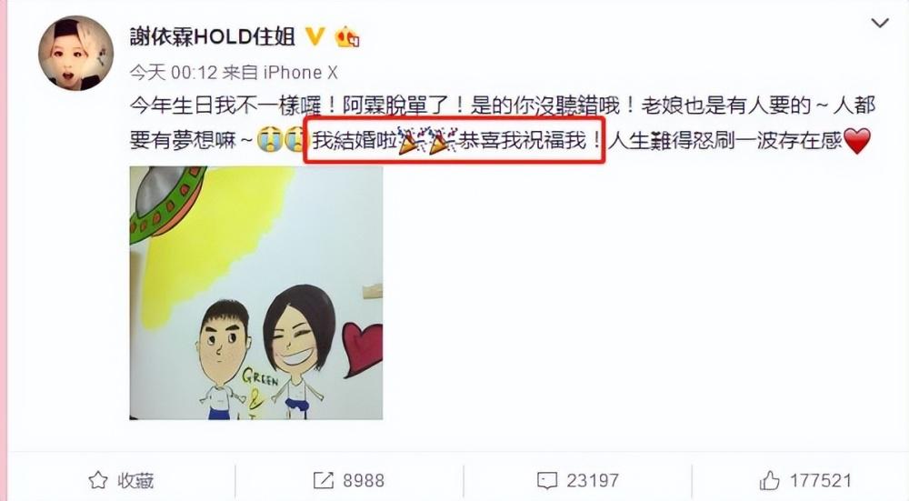 2018 年,谢依霖在自己生日当天官宣结婚,喊话 " 老娘也是有人要的 ",