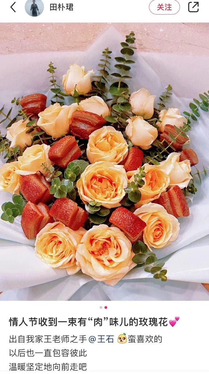 想起今年情人节的时候,田朴珺也秀过恩爱,晒的是老公送的红烧肉玫瑰,