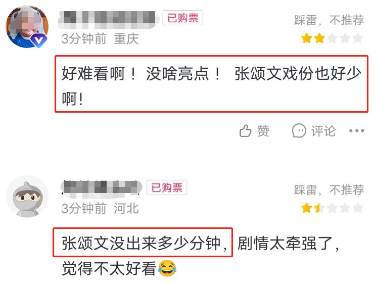 更有意思的是购票平台差评,连续两条都是观众质疑张颂文戏份少。