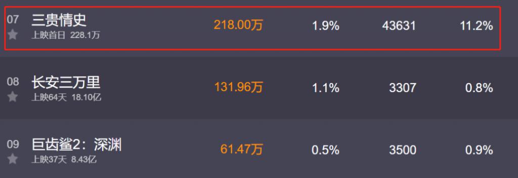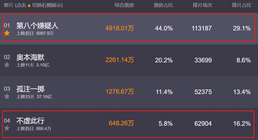 至于另外两部新片,就多少有点尴尬了。胡歌主演新片《不虚此行》、胡先煦主演新片《三贵情史》在上映第一天就掉队了,一个票房 600 多万一个票房 200 多万,破千万都艰难。