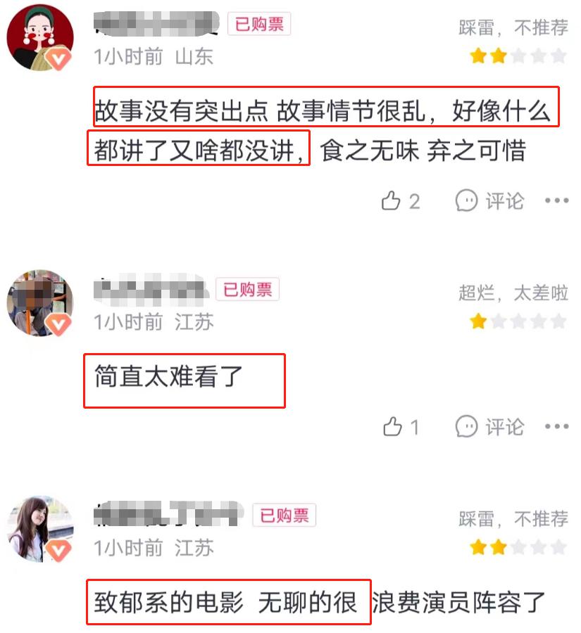 至于三部新片口碑,更是集体掉线,五星好评一眼空洞,低分差评有理有据,稍作了解懂得都懂,有观众三部新片看完,给出了一个统一评价—— " 菜鸡互啄 ",可见全员口碑都很糟糕。