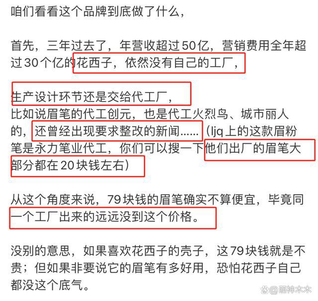 这次 " 眉笔事件 " 也让品牌方花西子遭到热议,大家都很好奇李佳琦为什么这么拼命给花西子站街,甚至不惜怒怼网友。然而花西子实在是不经扒,稍加了解就能知道:这个号称国货之光的品牌至今没有自己的工厂,产品全都是找代工,代工工厂生产的其他产品都只卖 2、30 块,这么算来花西子的产品质量如何、利润多高,大家就都心里有数了。