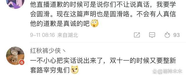 有网友指出这篇回应根本就是避重就轻,显然没有深刻认识自己的问题,那句 " 我作为主播应该一直带给大家积极的正能量,并学会控制情绪 " 意思不就是 " 我以后会装的更努力点 "?道歉只不过是为了利益的权宜之计,双十一快来了,还想继续赚大家的钱罢了。