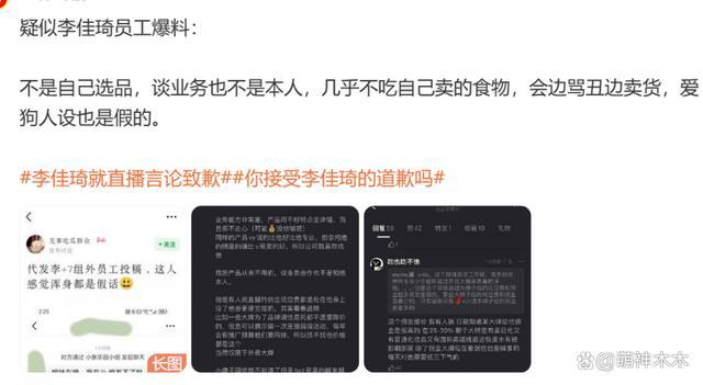 还有疑似员工出面爆料,现在李佳琦选品都不是自己亲自来,产品也不太用,现在之所以还在直播,是因为公司没有能培养起新人,必须靠他直播养着,而且他的狗狗都是员工帮忙养,自己边嫌弃产品丑边卖货。