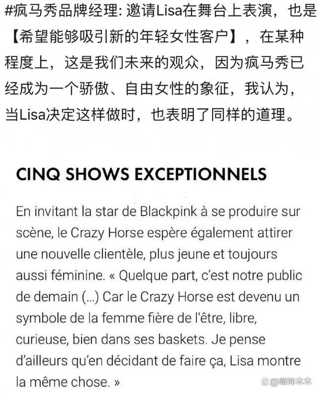 疯马秀品牌经理声称,邀请 Lisa 演出是希望能够吸引新的年轻女性客户,表示疯马秀是骄傲、自由的女性象征,如此言论实在可笑,典型的资本洗脑。