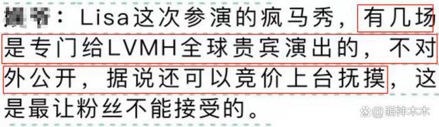 疯马秀介绍 Lisa 演出的时候表示她会公开表演五场,但知情人却表示,Lisa 还有不对外公开的演出,有几场是专门给奢侈品集团全球贵宾(VIP)演出的,据说还可以竞价上台抚摸。