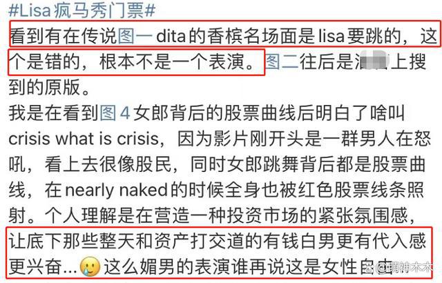 Lisa 疯马秀出圈后,网络上一度传言她要跳知名脱衣舞娘蒂塔 · 万提斯的经典曲目香槟舞,但实际上并非如此,Lisa 表演的曲目针对性远比香槟舞更强,节目设定在办公室,跳舞的时候背后都是红色股票线条照射,受众正是那些整天和资本打交道的有钱白男。