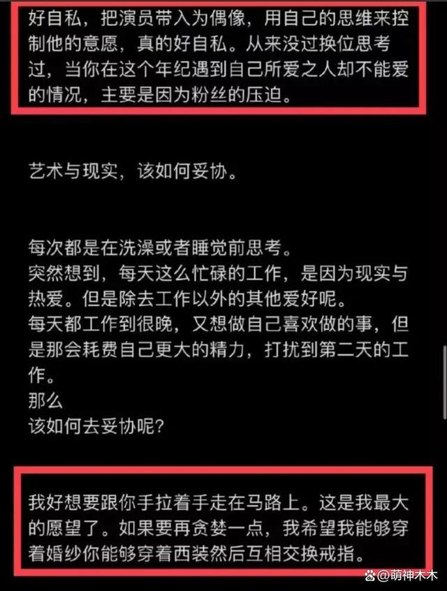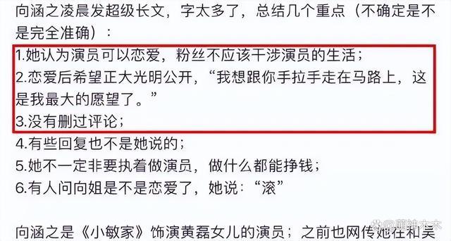虽然女方明确否认,可在这之前,向涵之曾发表过一篇千字文,文中的诸多细节隐隐透露她有喜欢的人,却无法公开,她还表达这样一种观点:粉丝不该干涉偶像恋爱。种种细节似乎表明她所爱的人与她一样也是圈内人,而且热度应该不低。