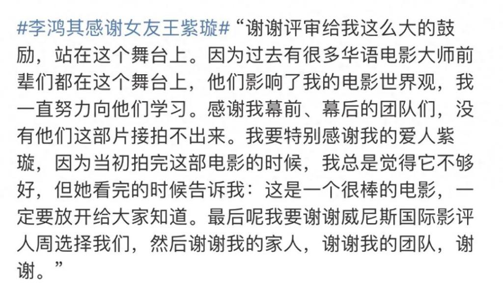 登台领奖发布获奖感言时,李鸿其先是感谢了自己电影幕前、幕后的工作人员。让人惊讶的是,他还突然感谢了自己的 " 爱人 " 王紫璇,表示他当初拍完这部电影时,总觉得不够好,但王紫璇看完后告诉他,这是一个很棒的电影," 你要给大家知道 "。