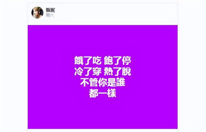 另外甄妮在个人账号还写下:饿了吃,饱了停,冷了穿,热了脱,不管你是谁都一样。